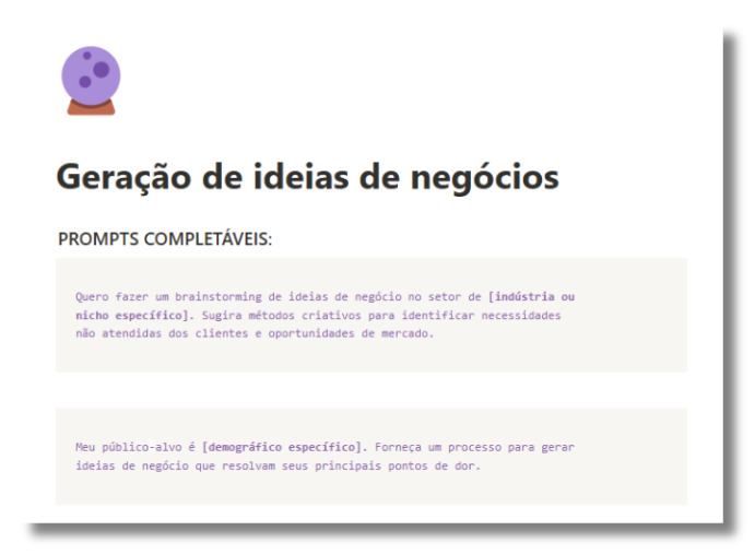Com nossos prompts, você descobre nichos lucrativos, cria modelos de negócio e define produtos para lançamento.