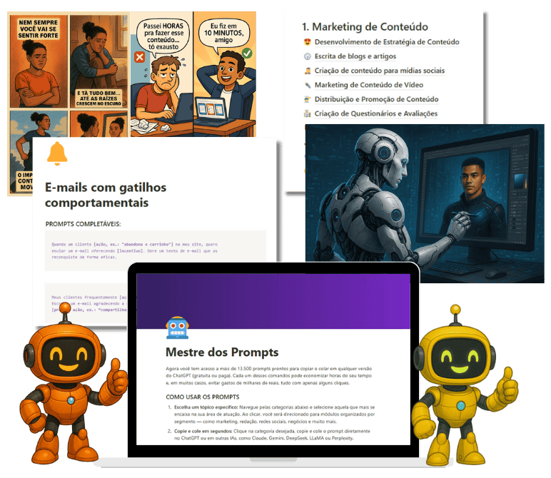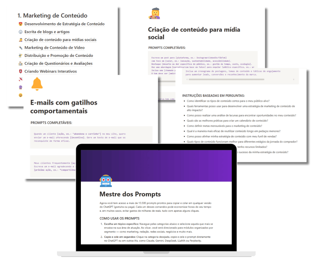 Eles foram organizados por categorias como marketing, redes sociais, vendas, produtividade, imagem, vídeo e vida pessoal — tudo para você economizar tempo, eliminar o bloqueio criativo e escalar seus resultados com inteligência artificial.
